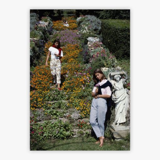 The Costa-Delords captures the grace and glamour of 1988 Asolo, Italy, where Slim Aarons photographed Delfina Costa-Delord and Alessia Costa-Delord beside a blooming flower garden with a classical statue. The two women, epitomes of Italian elegance, pose with effortless sophistication against the verdant backdrop, their casual stance embodying the refined leisure that defined la dolce vita. Every detail reveals Aarons' gift for finding beauty in these unguarded moments, making this photograph a window into a world where natural grace meets cultivated charm.