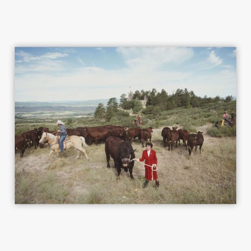 Introducing Tweet Kimball, a captivating visual narrative captured by Slim Aarons. This photograph transports you to the picturesque Cherokee Ranch in Castle Pines, Colorado, circa 1990. It depicts ranch owner Tweet Kimball sharing a tender moment with one of her prized Santa Gertrudis cattle, embodying the essence of American pastoral life with Aarons’ storytelling flair.