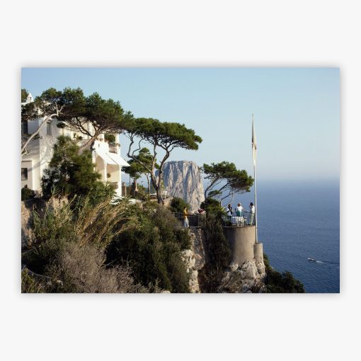 In this captivating visual narrative, a group of people gathers on a terrace, their laughter almost audible against the backdrop of Capri's stunning coastline. A flagpole punctuates the skyline, adding a subtle note of grandeur. The charm of Unghia Marina lies in its timelessness, with trees casually sprinkled along the marina, and the idyllic Italian scenery crafting a tableau that is both classic and refreshingly candid.